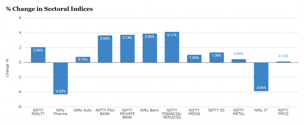 Nifty Financial Services came in as the top gainer today, beating Nifty Bank which came in a close second. Nifty Pharma and Nifty IT crashed today, and was among the top losers.