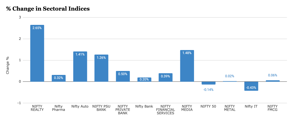 Nifty Realty was the best performing sector of the day, while Nifty IT stocks went down the most. Auto and PSU Banks continued to perform.