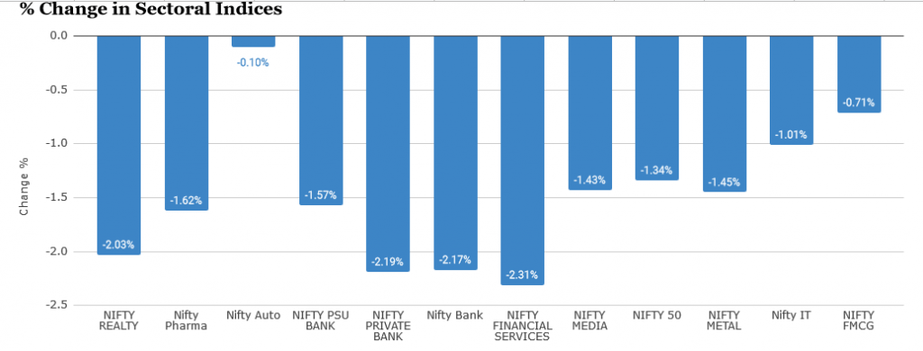 All major sectoral indices closed in red today. Nifty Bank was one of the worst performers of the day, along with Nifty Financial Services. Nifty Auto, although in red, closed only marginally in red.