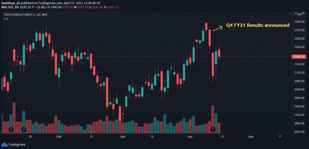 After making an all-time high of Rs 3354 a day before its Q4 FY21 results, TCS has been falling. It went down till Rs 3,073 but recovered a bit in the last two days to close at Rs 3195 on 16th April. The chart below will show how it gained so much in the last two weeks with the expectations of great results. The yellow arrow marks the day when the Q4 FY21 results were declared.