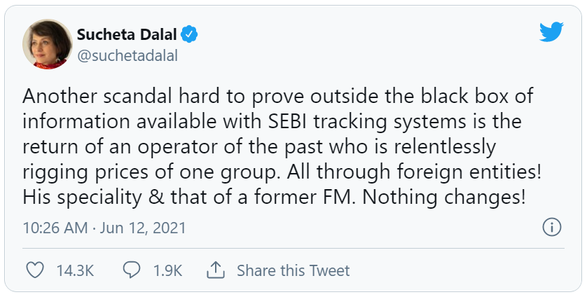 The tweet does not specifically mention any company or group, probably because Sucheta Dalal did not have sufficient evidence against them at that time. However, many in the Twitter universe quickly realised that she was referring to the Adani Group. The tweet indicates that the share prices of Adani Group companies were being manipulated or rigged. It also stated that market regulator SEBI was investigating the matter. Over the weekend, many began to speculate and find out the truth behind these serious allegations.