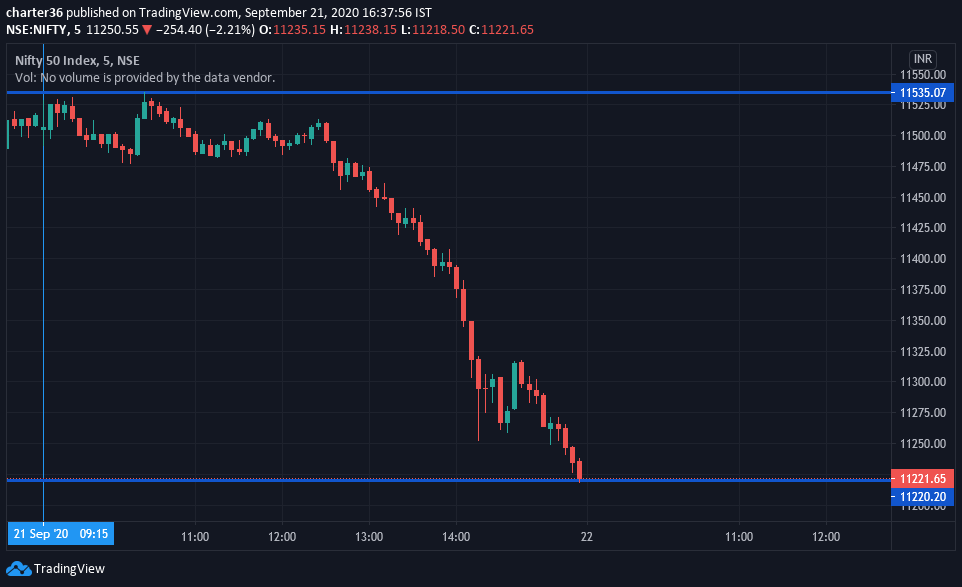 Nifty opened the day flat at 11,504 today and went up to 11,536 around 10.30am. From there, markets fell slowly to break 11,480 levels at 12.30pm when European markets opened and kept on going down. Many major supports were broken along the way with pressure from global markets pulling Nifty down, as well as fear about the impact of FinCEN files leak. A major fall was seen around 2pm time too, just like the days of past few falls. Nifty closed the day at 11,250.55, down 254.40 points or 2.21%, one of the worst falls in the past months.